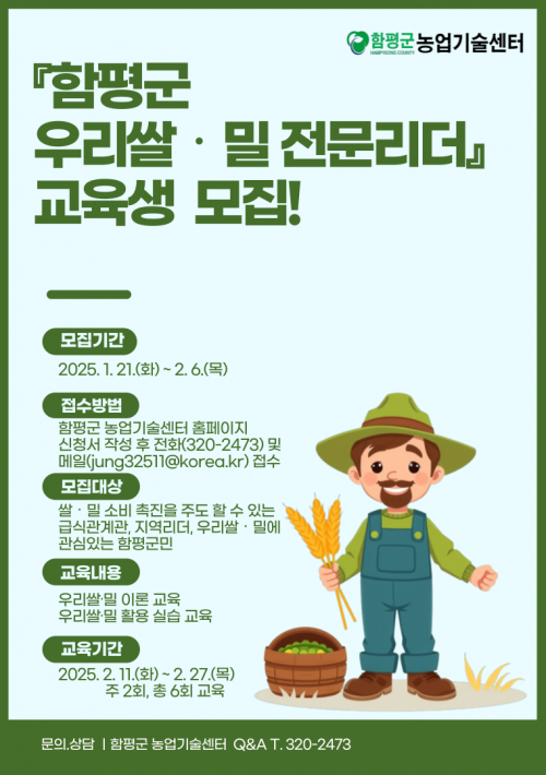 ÇÔÆò±º ³ó¾÷±â¼ú¼¾ÅÍ´Â 22ÀÏ ¡°ÇÔÆò±º ¿ì¸®½Ò‧¹Ð Àü¹®¸®´õ ±³À°ÀÌ ³»´Þ 11ÀϺÎÅÍ 27ÀϱîÁö ÃÑ 6ȸ ÇÔÆò±º ³ó¾÷±â¼ú¼¾ÅÍ¿¡¼­ ÁøÇàµÈ´Ù¡±°í ¹àÇû´Ù.