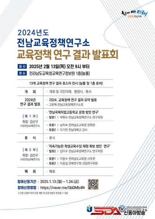 ¿À´Â 2¿ù 13ÀÏ, Àü¶ó³²µµ±³À°Ã»±³À°¿¬±¸Á¤º¸¿ø 1Ãþ ´ÃǰīÆä¿¡¼ Àü¶ó³²µµ±³À°Ã» ¼Ò¼Ó ±³Á÷¿ø, 17°³ ½Ãµµ ±³À°Á¤Ã¥¿¬±¸¼Ò °ü°èÀÚ¸¦ ´ë»óÀ¸·Î Àü³²±³À° Á¤Ã¥¿¬±¸ ¿¬±¸°á°ú¸¦ °øÀ¯Çϰí È®»êÇϱâ À§ÇÑ 2024. ±³À°Á¤Ã¥ ¿¬±¸ °á°ú ¹ßǥȸ¸¦ °³ÃÖÇÒ ¿¹Á¤ÀÌ´Ù.
