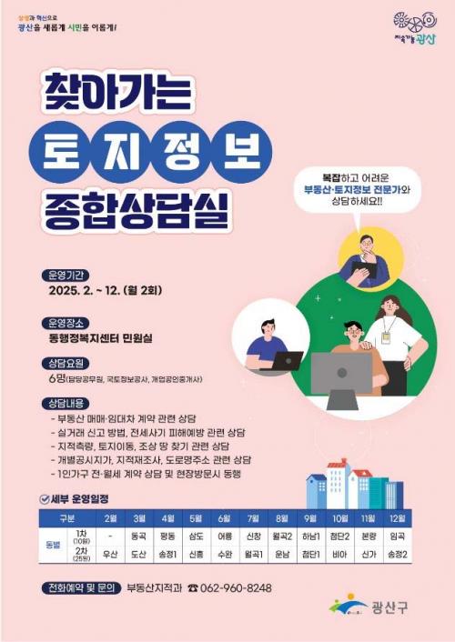 »ó´ã½ÇÀº ¸Å¿ù 10ÀÏ, 25ÀÏ¿¡ ¿¸®¸ç, µ¿ ÇàÁ¤º¹Áö¼¾ÅÍ ¹Î¿ø½Ç¿¡¼ ¿ùº°·Î »ó´ãÇϰí, µ¿º° ¿î¿µ ³¯Â¥´Â ±¤»ê±¸ ´©¸®ÁýÀ̳ª ±¤»ê±¸º¸¸¦ ÅëÇØ È®ÀÎÇÒ ¼ö ÀÖ´Ù.