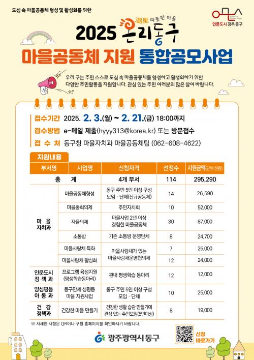 2025 ¿Â¸®µ¿±¸ ¸¶À»°øµ¿Ã¼ Áö¿ø ÅëÇÕ°ø¸ð»ç¾÷¿¡ ´ëÇÑ ÀÚ¼¼ÇÑ ³»¿ë°ú ½Åû ¹æ¹ýÀº µ¿±¸Ã» ´©¸®ÁýÀ» Âü°íÇÏ¸é µÈ´Ù.