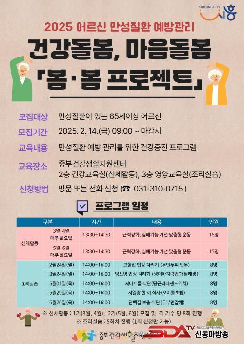 ½ÅüȰµ¿ ÇÁ·Î±×·¥Àº ¸ÂÃãÇü ¿îµ¿À» ÅëÇØ ±Ù·ÂÀ» °ÈÇÏ°í ½ÉÆó ±â´ÉÀ» °³¼±ÇÏ´Â µ¥ ÁßÁ¡À» µ×À¸¸ç, ¿µ¾ç±³À° ÇÁ·Î±×·¥Àº Á¶¸® ½Ç½ÀÀ¸·Î ±¸¼ºÇØ ³ë³â±â °Ç°½ÄÀÇ ¿øÄ¢¿¡ ¸Â´Â ¿Ã¹Ù¸¥ ½Ä½À°üÀ» ½ÇõÇÒ ¼ö ÀÖµµ·Ï µ½´Â´Ù. ÇÁ·Î±×·¥Àº 2Ãþ °Ç°±³À°½Ç(½ÅüȰµ¿)°ú 3Ãþ ¿µ¾ç±³À°½Ç(Á¶¸®½Ç½À)¿¡¼ ÁøÇàµÈ´Ù.