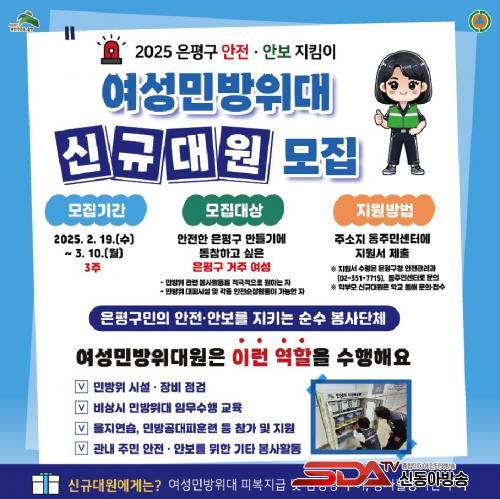 ¸ðÁý½Ã±â ±âÁØ ÀºÆò±¸ ¿©¼º¹Î¹æÀ§´ë¿øÀÇ Çö¿øÀº 82¸íÀÌ´Ù. ½Å±Ô ´ë¿øÀÇ Áö¿ø °¡´É Á¶°ÇÀº ±¸ÀÇ ¾ÈÀü‧¾Èº¸¸¦ À§ÇØ Àû±ØÀûÀ¸·Î ºÀ»çÇϰíÀÚ ÇÏ´Â ¸¶À½À» °®Ãá ÀÚ, ¹Î¹æÀ§ ´ëÇǽü³ ¹× ±¸¹ÎÀ» À§ÇÑ °¢Á¾ ¾ÈÀü¼øÂûȰµ¿ÀÌ °¡´ÉÇÑ ÀÚ·Î À§ÀÇ 2°¡Áö¸¦ ÃæÁ·ÇÏ´Â ÀºÆò±¸ °ÅÁÖ ¿©¼ºÀÌ´Ù.
