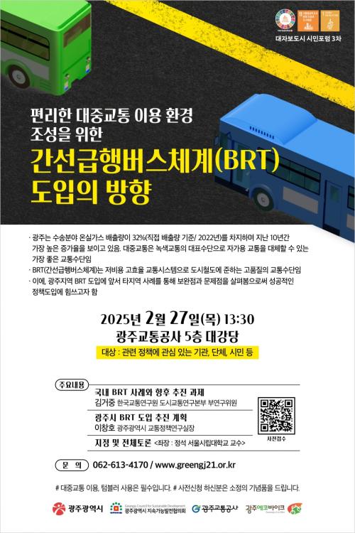 À̳¯ Æ÷·³¿¡¼´Â ¼¿ï¡¤¼¼Á¾¡¤ºÎ»ê µî ±¹³» BRT µµÀÔ°ú ¿î¿µ »ç·Ê¸¦ »ìÆìº¸°í Àü¹®°¡¿Í ½Ã¹ÎÀÇ ÀǰßÀ» µè´Â´Ù. ±¤Áֽô Æ÷·³¿¡¼ Á¦½ÃµÈ Á¤Ã¥Àû Á¦¾ðÀ» ±¤Áֽà ±³ÅëÁ¤Ã¥ ¼ö¸³¿¡ Âü°íÇÒ °èȹÀÌ´Ù.
