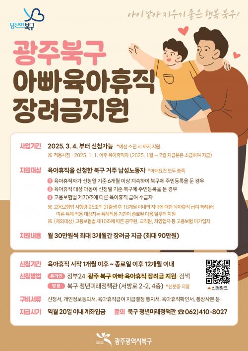 ¡®¾Æºü À°¾ÆÈÞÁ÷ Àå·Á±Ý¡¯ Áö¿øÀº ¾ÆÀÌ ³º¾Æ Ű¿ì±â ÁÁÀº ºÏ±¸ Á¶¼º»ç¾÷ÀÇ ÀÏȯÀ¸·Î À°¾ÆÈÞÁ÷ ÁßÀÎ ³²¼º ³ëµ¿ÀÚ¿¡°Ô ¿ù 30¸¸ ¿øÀÇ Àå·Á±ÝÀ» ÃÖ´ë 3°³¿ù°£ Áö±ÞÇÏ¿© ÈÞÁ÷¿¡ µû¸¥ °æÁ¦Àû ºÎ´ãÀ» ¿ÏÈ­ÇÏ°í ³²¼ºÀÇ À°¾ÆÈÞÁ÷À» Àå·ÁÇϰíÀÚ ºÏ±¸¿¡¼­ ¿ÃÇØ óÀ½ ÃßÁøÇÏ´Â ½ÃÃ¥ÀÌ´Ù.