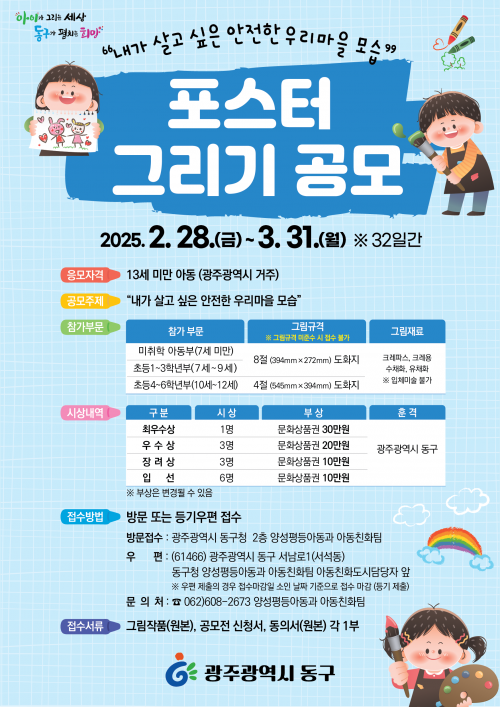 ÀÀ¸ð ±â°£Àº 31ÀϱîÁöÀ̸ç, ±¤ÁÖ °ÅÁÖ 12¼¼ ÀÌÇÏ ¾Æµ¿ÀÌ¸é ´©±¸³ª Âü¿© °¡´ÉÇÏ´Ù. Âü°¡¸¦ ¿øÇÏ´Â ¾Æµ¿Àº µ¿±¸ ´©¸®Áý¿¡¼ ¾ç½Ä µîÀ» ÂüÁ¶ÇØ ÀÛǰ°ú ÇÔ²² Á¦ÃâÇÏ¸é µÈ´Ù. ±âŸ ÀÚ¼¼ÇÑ »çÇ×Àº ¾ç¼ºÆòµî¾Æµ¿°ú ¾Æµ¿Ä£ÈÆÀ(¢Ï062-608-2673)·Î ¹®ÀÇÇÏ¸é µÈ´Ù.