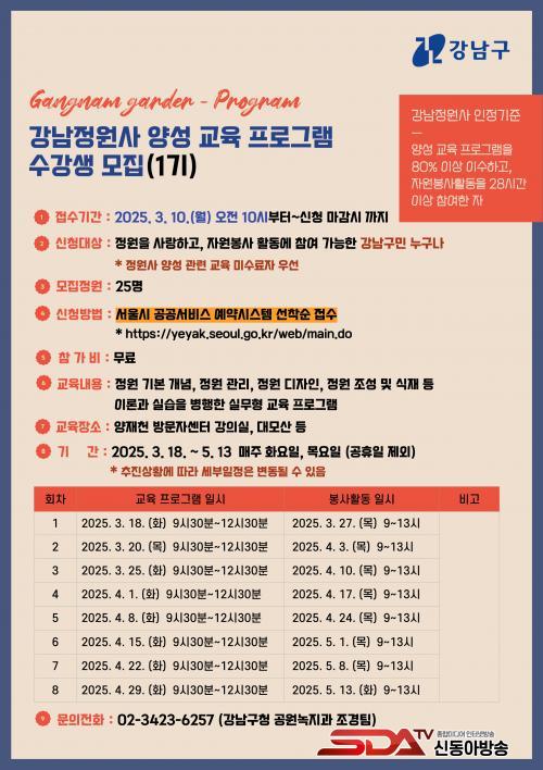 ±â¼öº° Âü¿© ÀοøÀº 25¸í À̳»À̸ç, Á¤¿ø °¡²Ù±â¿¡ °ü½É ÀÖ°í ÀÚ¿øºÀ»ç Ȱµ¿ÀÌ °¡´ÉÇÑ °­³²±¸¹ÎÀÌ¸é ´©±¸³ª Âü¿©ÇÒ ¼ö ÀÖ´Ù. Âü°¡ÇÏ°í ½ÍÀº »ç¶÷Àº 3¿ù 10ÀÏ ¿ÀÀü 10½ÃºÎÅÍ ¼­¿ï½Ã °ø°ø¿¹¾à¼­ºñ½º ȨÆäÀÌÁö¸¦ ÅëÇØ Á¢¼öÇÏ¸é µÈ´Ù. 1±â ±³À° ÇÁ·Î±×·¥ ¹× ÀÚ¿øºÀ»ç Ȱµ¿ ±â°£Àº 3¿ù 18ÀϺÎÅÍ 5¿ù 13ÀϱîÁöÀÌ´Ù. ´õ ±Ã±ÝÇÑ ³»¿ëÀº °­³²±¸Ã» ȨÆäÀÌÁö¿¡¼­ È®ÀÎÇϰųª °ø¿ø³ìÁö°ú(¢Ï02-3423-6257)·Î ¹®ÀÇÇÏ¸é µÈ´Ù.