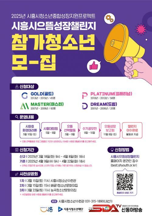 ÇÁ·Î±×·¥ Âü°¡ ´ë»óÀº ½ÃÈï½Ã¿¡ °ÅÁÖÇϰí Àִ û¼Ò³âÀÌ¸ç °ñµå(2013³â~2015³â»ý, 45¸í), Ç÷¡Æ¼³Ñ(2010³â~2012³â»ý, 58¸í), ¸¶½ºÅÍ(2007³â~2009³â»ý, 60¸í), µå¸²(2001³â~2006³â»ý, 20¸í) ÃÑ ³× °³ÀÇ ·¹º§·Î ¸ðÁýÇÑ´Ù. ½Å±Ô Âü°¡ÀÚ´Â 3¿ù 18ÀϺÎÅÍ 4¿ù 8ÀϱîÁö, ±âÁ¸ Âü°¡ÀÚ´Â 4¿ù 9ÀϺÎÅÍ 4¿ù 22ÀϱîÁö ½ÃÈï½ÃÀ¸¶ä¼ºÀå縰Áö ´©¸®ÁýÀ» ÅëÇØ ½ÅûÇÒ ¼ö ÀÖ´Ù.