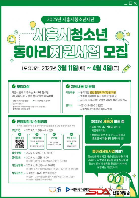 ÇÑÆí, ½Ã´Â 2025³â ¡®Ã»¼Ò³âµ¿¾Æ¸® Áö¿ø»ç¾÷¡¯ÀÇ ±Ô¸ð¸¦ È®´ëÇØ 550°³ÀÇ µ¿¾Æ¸®¸¦ ¸ðÁýÇÑ´Ù. Àü±¹ ÃÖ´ë ±Ô¸ð·Î ¿î¿µµÇ´Â ½ÃÈï½Ãû¼Ò³âµ¿¾Æ¸®Áö¿ø»ç¾÷Àº ¿ÃÇØ·Î 12³â°¸¦ ¸ÂÀÌÇϸç, 2014³â 30°³ µ¿¾Æ¸®·Î ½ÃÀÛÇØ 2024³â 523°³ û¼Ò³â µ¿¾Æ¸®°¡ Âü¿©Çß´Ù.