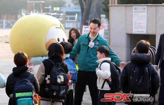 ¿À¾ð¼® µµºÀ±¸Ã»Àå(°¡¿îµ¥)ÀÌ Áö¿ª ³» ÇÑ ÃʵîÇб³ µî±·±æ¿¡¼­ Çлýµé°ú ¹Ý°©°Ô Àλ縦 ³ª´©°í ÀÖ´Ù(2025. 3. 10. â°æÃʵîÇб³)