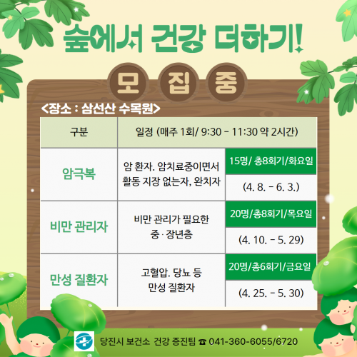 [½Åµ¿¾Æ¹æ¼Û=ÀÌÀçö±âÀÚ] ´çÁø½Ãº¸°Ç¼Ò(¼ÒÀå ¹ÚÁ¾±Ô)´Â °Ç°­°ü¸®°¡ ÇÊ¿äÇÑ ÁúȯÀÚ ¸ÂÃ㠰ǰ­°ü¸®¸¦ À§ÇØ ¿À´Â 4¿ù 8ÀϺÎÅÍ 6¿ù 3ÀϱîÁö¡®½£¿¡¼­ °Ç°­ ´õÇϱ⡯ ÇÁ·Î±×·¥À» »ï¼±»ê ¼ö¸ñ¿ø¿¡¼­ ÁøÇàÇÑ´Ù°í ¹àÇû´Ù.