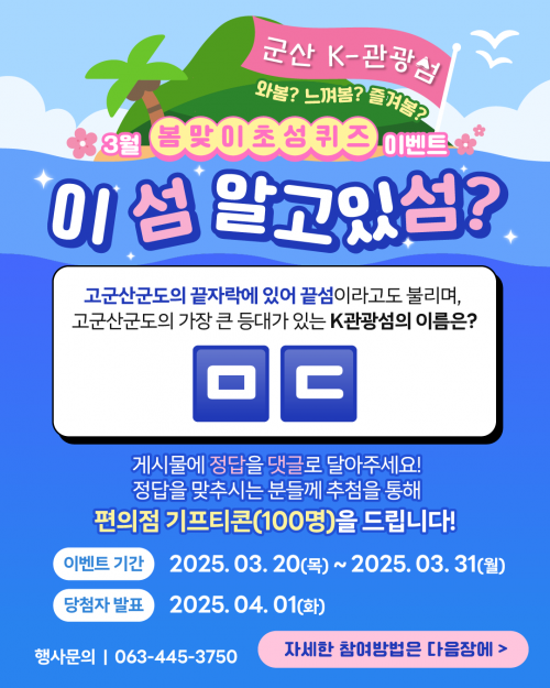 ¸ÕÀú, 3¿ù 20ÀϺÎÅÍ 31ÀϱîÁö k-°ü±¤¼¶(¸»µµ,¸íµµ,¹æÃ൵) Ãʼº ¸ÂÃß±â ÄûÁî À̺¥Æ®°¡ ¿¸®´Âµ¥, ±º»ê k-°ü±¤¼¶ ÀνºÅ¸±×·¥ ÆÈ·Î¿ö¶ó¸é ´©±¸³ª Âü¿©ÇÒ ¼ö ÀÖ´Ù. Á¾·á ÈÄ¿¡´Â Âü¿©ÀÚ Áß Ãß÷À» ÅëÇØ ¼ÒÁ¤ÀÇ ¸ð¹ÙÀÏ »óǰ±ÇÀ» Áö±ÞÇÑ´Ù.