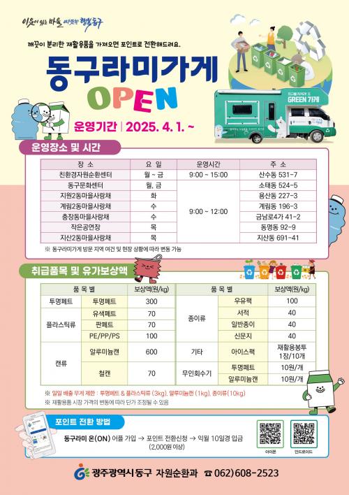 µ¿±¸¶ó¹Ì °¡°Ô´Â °¡Á¤¿¡¼ ±ú²ýÇÏ°Ô ¼¼Ã´ÇÏ°í ºÐ·ùÇÑ ÀçȰ¿ë °¡´É ÀÚ¿øÀ» °¡Á®¿À¸é ǰ¸ñº°·Î ¹«°Ô ±âÁØ¿¡ µû¶ó ÀÚ¿ø ¼øÈ¯ ÅëÇÕÇ÷§Æû ¾îÇà ¡®µ¿±¸¶ó¹Ì ¿Â¡¯ Æ÷ÀÎÆ®¸¦ Àû¸³, Çö±ÝÀ¸·Î º¸»óÇØ ÁØ´Ù. º¸»ó ǰ¸ñÀº Åõ¸í ÆäÆ®, ÇÃ¶ó½ºÆ½·ù, ĵ·ù, Á¾ÀÌ·ù, Á© ¾ÆÀ̽ºÆÑ µî 11°¡Áö°¡ ÇØ´çµÈ´Ù.