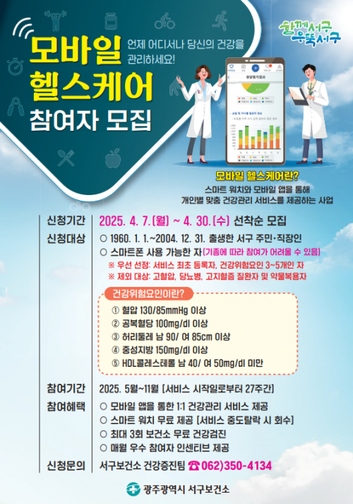 ¸ðÁý ´ë»óÀº °Ç°°ü¸®¿¡ °ü½É ÀÖ´Â 1960~2004³â»ý ¼±¸ ÁֹΠ¶Ç´Â ¼±¸¿¡¼ ±Ù¹«ÇÏ´Â Á÷ÀåÀÎ 150¸íÀ¸·Î ¡ãÇ÷¾Ð 130/85mmHg ÀÌ»ó ¡ã°øº¹Ç÷´ç 100mg/dL ÀÌ»ó ¡ãÇ㸮µÑ·¹ ³²ÀÚ 90cm(¿©ÀÚ 85cm) ÀÌ»ó ¡ãÁß¼ºÁö¹æ 150mg/dL ÀÌ»ó ¡ãHDL-ÄÝ·¹½ºÅ×·Ñ ³²ÀÚ 40mg/dL(¿©ÀÚ 50mg/dL) ¹Ì¸¸ µîÀÇ °Ç° À§Çè ¿äÀÎ Áß 3°³ ÀÌ»ó ÇØ´çÇÏ´Â °æ¿ì ¿ì¼± ¼±¹ßµÇ¸ç, °íÇ÷¾Ð, ´ç´¢º´, °íÁöÇ÷Áõ ÁúȯÀÚ ¹× ¾à¹° º¹¿ëÀÚ´Â Á¦¿ÜµÈ´Ù. ½Åû µî ÀÚ¼¼ÇÑ »çÇ×Àº º¸°Ç¼Ò °Ç°ÁõÁøÆÀ(062-350-4134)¿¡ ¹®ÀÇÇÏ¸é µÈ´Ù.