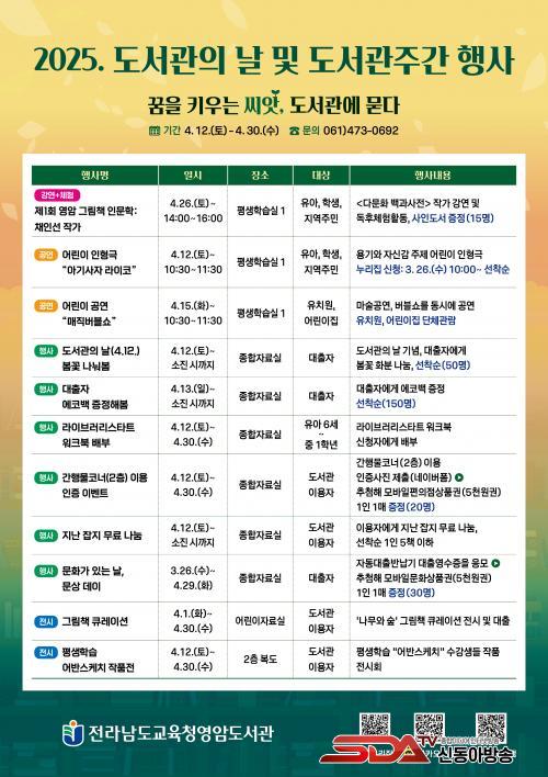 µµ¼°üÀÇ ³¯À» ±â³äÇØ 4¿ù 12ÀÏ(Åä)¿¡´Â µµ¼°üÀÇ ³¯(4.12.), º½²É ³ª´²º½(´ëÃâÀÚ ¼±Âø¼ø 50¸í)Çϰí, ¾î¸°ÀÌ ÀÎÇü±Ø¡º¾Æ±â»çÀÚ ¶óÀÌÄÚ¡»¸¦ ¿î¿µÇÑ´Ù. 4¿ù 15ÀÏ(È)¿¡´Â À¯Ä¡¿ø, ¾î¸°ÀÌÁý ¾ÆÀ̵éÀÌ ¾î¸°ÀÌ °ø¿¬¡º¸ÅÁ÷¹öºí¼î¡»¸¦ ´Üü°ü¶÷ÇÒ ¿¹Á¤ÀÌ´Ù. ¶ÇÇÑ 4¿ù 26ÀÏ(Åä)¿¡´Â Á¦1ȸ ¿µ¾Ï ±×¸²Ã¥ Àι®ÇÐ: äÀμ± ÀÛ°¡ÀÇ °¿¬À» ÁøÇàÇÑ´Ù.