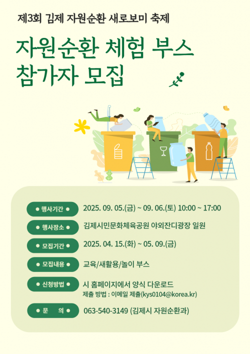 [½Åµ¿¾Æ¹æ¼Û=Á¶Á¾Çö±âÀÚ] ±èÁ¦½Ã(½ÃÀå Á¤¼ºÁÖ)´Â¡®Á¦3ȸ ±èÁ¦ ÀÚ¿ø¼øÈ¯ »õ·Îº¸¹Ì ÃàÁ¦¡¯¿¡¼­ ÀçȰ¿ëǰÀ» Ȱ¿ëÇÑ Ã¼Çè ºÎ½º¸¦ ¿î¿µÇÒ Âü°¡ÀÚ¸¦ ´ÙÀ½´Þ 9ÀϱîÁö ¸ðÁýÇÑ´Ù°í 15ÀÏ ¹àÇû´Ù.