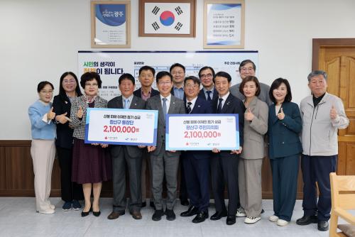 15ÀÏ ±¤»ê±¸ ÅëÀå´Ü(ȸÀå È«¼ºÈ) °ú ÁÖ¹ÎÀÚġȸ(ȸÀå ±è´ë¼º)°¡ ±¤»ê±¸Ã»¿¡¼ Àü´Þ½ÄÀ» °®°í »çȸº¹Áö°øµ¿¸ð±Ýȸ¿¡ ¼º±ÝÀ» Àü´ÞÇß´Ù.
