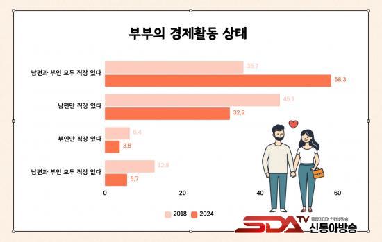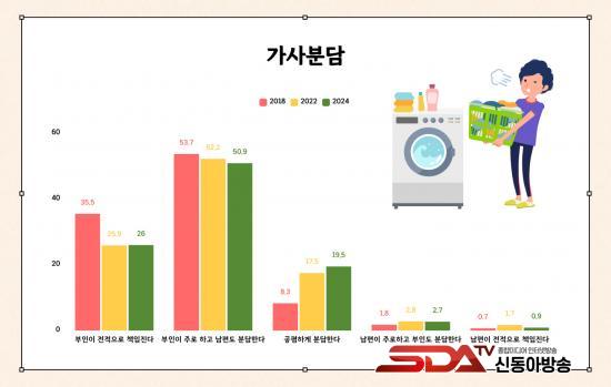 Á¶»ç °á°ú, ¸Â¹úÀÌ ºÎºÎ ºñÀ²Àº 2018³â 35.7%, 2022³â 50.3%¿¡ À̾î 2024³â 58.3%·Î ²ÙÁØÈ÷ Áõ°¡Çϰí ÀÖÀ¸³ª, °¡»ç ºÐ´ã¿¡ ´ëÇÑ ÀνÄÀº ¿©ÀüÈ÷ ÀüÅëÀû ¼º ¿ªÇÒ¿¡¼ Å©°Ô ¹þ¾î³ªÁö ¸øÇϰí ÀÖ´Â °ÍÀ¸·Î ³ªÅ¸³µ´Ù. °¡»ç ºÐ´ãÀº ¡®ºÎÀÎÀÌ ÁÖ·Î ÇÏ°í ³²Æíµµ ºÐ´ãÇÑ´Ù¡¯´Â ÀÀ´äÀÌ 50.9%·Î °¡Àå ¸¹¾Ò°í, ¡®°øÆòÇÏ°Ô ºÐ´ãÇÑ´Ù¡¯´Â ÀÀ´äÀº 19.5%¿¡ ±×ÃÆ´Ù. ƯÈ÷ ¸Â¹úÀÌ ºñÀ²ÀÌ °¡Àå ³ôÀº 40´ë¿¡¼´Â ¡®ºÎÀÎÀÌ ÁÖ·Î ÇÑ´Ù¡¯´Â ÀÀ´äÀÌ 63.0%¿¡ ´ÞÇØ °¡»ç³ëµ¿ÀÇ ¼ºº° ºÒ±ÕÇüÀÌ µÎµå·¯Á³´Ù.