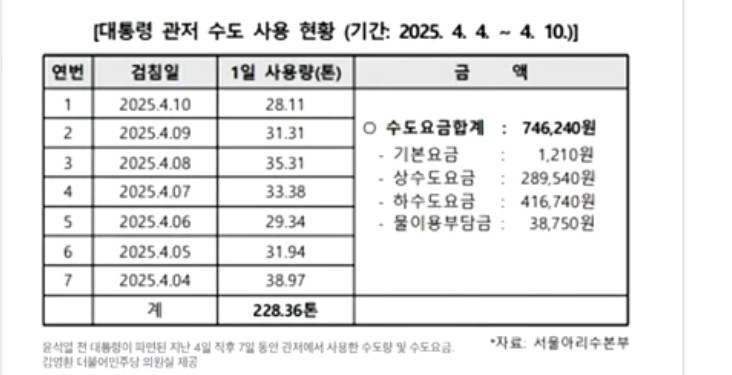 ±è ÀÇ¿ø¿¡ µû¸£¸é À±¼®¿°ú ±è°ÇÈñ°¡ ÆÄ¸éµÈ 4ÀϺÎÅÍ Åð°Å ÇÏ·ç ÀüÀÎ 10ÀϱîÁö °üÀú¿¡¼ »ç¿ëÇÑ ¼öµµ¹°Àº 228.36ÅæÀ¸·Î, 4ÀÏ¿£ 38.97Åæ, 5ÀÏ¿£ 31.94ÅæÀ» »ç¿ëÇßÀ¸¸ç, 10ÀÏ¿£ 28.11ÅæÀ» »ç¿ëÇß´Ù°í 16ÀÏ ¼¿ï¾Æ¸®¼öº»ºÎ·ÎºÎÅÍ Á¦Ãâ ¹ÞÀº ÀڷḦ °ø°³Çß´Ù.