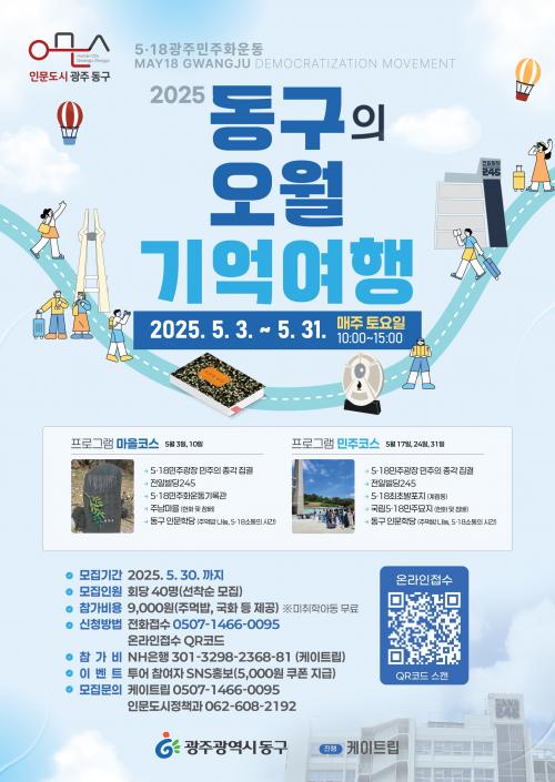 À̹ø Åõ¾î´Â °ü³» 5¡¤18 ÁÖ¿ä »çÀûÁö¸¦ ¡®¸¶À» ÄÚ½º¡¯, ¡®¹ÎÁÖ ÄÚ½º¡¯ 2°³ ÄÚ½º·Î ±¸¼ºÇØ ÇØ¼³»ç¿Í µÑ·¯º¸´Â ½Ã°£À¸·Î, 5¿ù ÇÑ ´Þ µ¿¾È ¸ÅÁÖ Åä¿äÀÏ ¿ÀÀü 10½ÃºÎÅÍ ¿ÀÈÄ 3½Ã±îÁö ÁøÇàÇÑ´Ù. 1ȸ´ç 40¸í ÃÑ 200¸íÀ» ¸ðÁýÇÒ °èȹÀÌ´Ù.