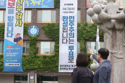 [½Åµ¿¾Æ¹æ¼Û=±èÀçÂù±âÀÚ] 9ÀÏ ±¤ÁÖ ºÏ±¸¿¡¼´Â Á¦21´ë ´ëÅë·É¼±°Å¸¦ ¾ÕµÎ°í ºÏ±¸Ã»»ç ¿Üº®¿¡ ÅõÇ¥ Âü¿©¸¦ ¾È³»ÇÏ´Â ¡®¹ÎÁÖÁÖÀÇ´Â ÅõÇ¥·Î ¿Ï¼ºµË´Ï´Ù¡¯¶ó´Â ¹®±¸ÀÇ ´ëÇü Çö¼ö¸·À» °Ô½ÃÇß´Ù. ´õºÒ¾î ¿Â¿ÀÇÁ¶óÀΠä³ÎÀ» Ȱ¿ëÇÑ Á¾ÇÕÀûÀÎ ÅõÇ¥ È«º¸ ¹æ¾ÈÀ» ¸¶·ÃÇÏ°í ¼±°Å ´çÀϱîÁö ÅõÇ¥ µ¶·Á¿¡ ³ª¼³ ¿¹Á¤ÀÌ´Ù.