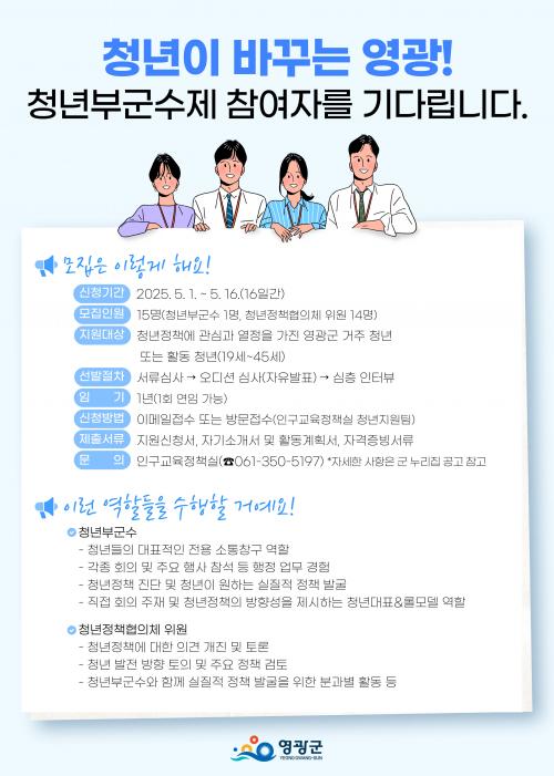 ¸ðÁý ºÐ¾ß´Â ¡ãû³â ºÎ±º¼ö 1¸í ¡ãû³âÁ¤Ã¥À§¿ø 14¸íÀ¸·Î, ¸¸ 19¼¼ºÎÅÍ 45¼¼ ÀÌÇÏÀÇ ¿µ±¤±º °ÅÁÖÀÚ ¶Ç´Â °ü³»¿¡¼ Ȱµ¿ ÁßÀΠû³âÀÌ¸é ´©±¸³ª Áö¿øÇÒ ¼ö ÀÖ´Ù. ¸ðÁý ¸¶°¨Àº ¿À´Â 5¿ù 16ÀϱîÁö´Ù.