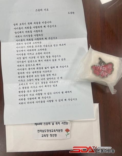 [½Åµ¿¾Æ¹æ¼Û Àü³²À强=À̽ŵ¿±âÀÚ] Àü¶ó³²µµÀ强±³À°Áö¿øÃ»ÀÌ 5¿ù 15ÀÏ ¡®Á¦44ȸ ½º½ÂÀÇ ³¯¡¯À» ¸Â¾Æ °ü³» À¯¡¤ÃÊ¡¤Áß¡¤°í 27°³±³¸¦ Á÷Á¢ ¹æ¹®ÇØ ±³Á÷¿øÀ» °Ý·ÁÇϰí, ±³À°È°µ¿ÀÇ ¾Ö·Î »çÇ×À» ûÃëÇÏ´Â ¡®°ø°¨¼ÒÅëÀÇ ³¯¡¯À» ¿î¿µÇß´Ù.