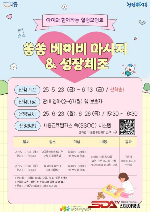 À̹ø ÇÁ·Î±×·¥Àº »ýÈÄ 2°³¿ùºÎÅÍ 6°³¿ù±îÁöÀÇ °ü³» ¿µ¾Æ¿Í º¸È£ÀÚ¸¦ ´ë»óÀ¸·Î ÁøÇàµÈ´Ù. ¾ÆÀÌÀÇ ¼ºÀå ¹ß´ÞÀ» ÃËÁøÇÏ°í º¸È£ÀÚ¿ÍÀÇ À¯´ë°¨À» ³ôÀÏ ¼ö ÀÖ´Â ±âº» ¸¶»çÁö ±â¹ý°ú ¼ºÀå üÁ¶ ±³À°ÀÌ Á᫐ ³»¿ëÀÌ´Ù. Àü¹® º£À̺ñ ¸¶»çÁö °»çÀÎ ¸ðÀ±Á¤ ¾¾°¡ ±³À°À» ÁøÇàÇÑ´Ù.