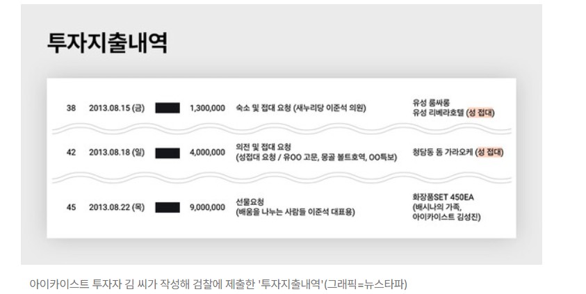´º½ºÅ¸ÆÄ°¡ °ø°³ÇÑ ÅõÀÚÀÚ ±è ¾¾ÀÇ ÀåºÎ´Â, ±è¼ºÁøÀÇ »ç±â Çà°¢À» ¾Ë¾ÆÃ¦ ±è ¾¾°¡ 2017³â¿¡ ±×¸¦ »ç±â ÇøÀÇ µîÀ¸·Î ´ëÀüÁö°Ë¿¡ °í¼ÒÇÏ¸é¼ µå·¯³µ´Âµ¥, ´º½ºÅ¸ÆÄ°¡ º¸µµÇÑ °ËÂû ¼ö»ç±â·ÏÀº, ±è ¾¾ ÀÚ½ÅÀÇ °èÁ ³»¿ª°ú ¹®ÀÚ¸Þ½ÃÁö µîÀ» ±Ù°Å·Î ÀÛ¼ºÇÑ 'ÁöÃâ³»¿ª¼'·Î ±Ý¾×Àº 15¾ï¿¡ ´ÞÇÏ´Â, ÀÚ½ÅÀÌ Á¦°øÇÑ Á¢´ë¿Í ±ÝǰÀ» ÀÏÀÚº°·Î Á¤¸®ÇÑ ÀÏÁ¾ÀÇ '»ó³³ ÀåºÎ'Àε¥, ¿©±â¿¡ ÀÌÁؼ®¿¡°Ô ¼º Á¢´ë Á¦°ø ±â·ÏÀÌ ³ª¿Â °ÍÀÌ´Ù.