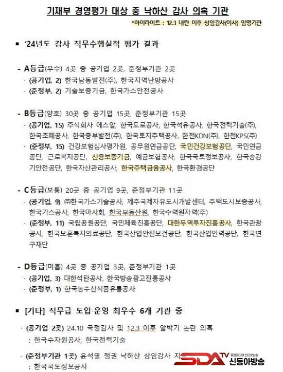 ÀÌ¿Í À¯»çÇÑ ¹®Á¦´Â 24³âµµ °¨»ç Á÷¹«¼öÇà½ÇÀû Æò°¡ °á°ú¿¡¼­µµ ¹Ýº¹µÆ´Ù. Aµî±ÞÀ» ¹ÞÀº ±â°üÀº Çѱ¹³²µ¿¹ßÀü, Çѱ¹Áö¿ª³­¹æ°ø»ç, ±â¼úº¸Áõ±â±Ý, Çѱ¹°¡½º¾ÈÀü°ø»ç µî 4°÷À̸ç, Bµî±ÞÀ» ¹ÞÀº ±â°üÀº ÃÑ 30°÷¿¡ ´ÞÇÑ´Ù. À̵é Áß¿¡´Â ¿¡½º¾Ë(SR), Çѱ¹µµ·Î°ø»ç, °Ç°­º¸Çè½É»çÆò°¡¿ø, Çѱ¹ÁÖÅñÝÀ¶°ø»ç µî ÁÖ¿ä °ø°ø±â°üÀÌ Æ÷ÇԵǾî ÀÖÀ¸¸ç, »óÀÓ°¨»ç ¿ª½Ã ³«ÇÏ»ê ÀÎ»ç ³í¶õÀÇ Á߽ɿ¡ ÀÖ¾ú´ø Àι°µéÀÌ ´Ù¼ö Á¸ÀçÇÑ´Ù.