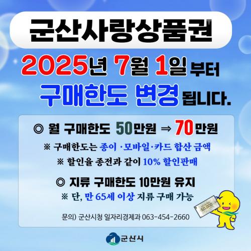 [½Åµ¿¾Æ¹æ¼Û=À̺´½Ä±âÀÚ] ±º»ê½Ã°¡ 7¿ùºÎÅÍ ±º»ê»ç¶û»óǰ±ÇÀÇ ¿ù ±¸¸Å Çѵµ¸¦ ±âÁ¸ 50¸¸ ¿ø¿¡¼­ 70¸¸ ¿øÀ¸·Î È®´ë ¿î¿µÇÑ´Ù. À̹ø °áÁ¤Àº ħüµÈ Áö¿ª°æÁ¦¸¦ Ȱ¼ºÈ­ÇÏ°í ¼Ò»ó°øÀεéÀÇ ¸ÅÃâ ȸº¹À» Áö¿øÇϱâ À§Çؼ­ ¸¶·ÃµÆ´Ù.