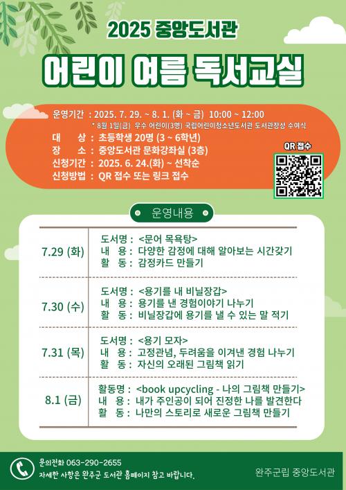 Âü°¡ ½ÅûÀº ¿ÏÁÖ±º Áß¾Óµµ¼°ü ȨÆäÀÌÁö(https://lib.wanju.go.kr)ÀÇ µ¶¼¹®ÈÇà»ç ¾È³»¿¡¼ °¡´ÉÇϸç, ¸µÅ© ¶Ç´Â QRÄڵ带 ÅëÇÑ Á¢¼öµµ °¡´ÉÇÏ´Ù. ¹®ÀÇÀüÈ´Â 063-290-2655·Î ÇÏ¸é µÈ´Ù.