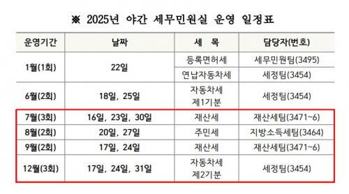 7¿ù ¾ß°£ ¼¼¹«¹Î¿ø½ÇÀº Àç»ê¼¼(6¿ù 1ÀÏ ±âÁØ ÁÖÅÃ, °ÇÃ๰, ¼±¹Ú ¼ÒÀ¯ÀÚ) ³³ºÎ ±â°£ÀÎ 7¿ù 16ÀÏ ~ 7¿ù 31ÀÏ Áß ¼ö¿äÀÏÀÎ 16ÀÏ¡¤23ÀÏ¡¤30ÀÏ ¿ÀÈÄ 6½ÃºÎÅÍ 9½Ã±îÁö 3½Ã°£ µ¿¾È ´çÁø½Ãû 1Ãþ ¼¼¹«°ú 43¹ø°ú 44¹ø ⱸ¿¡¼ ¿î¿µÇÑ´Ù.