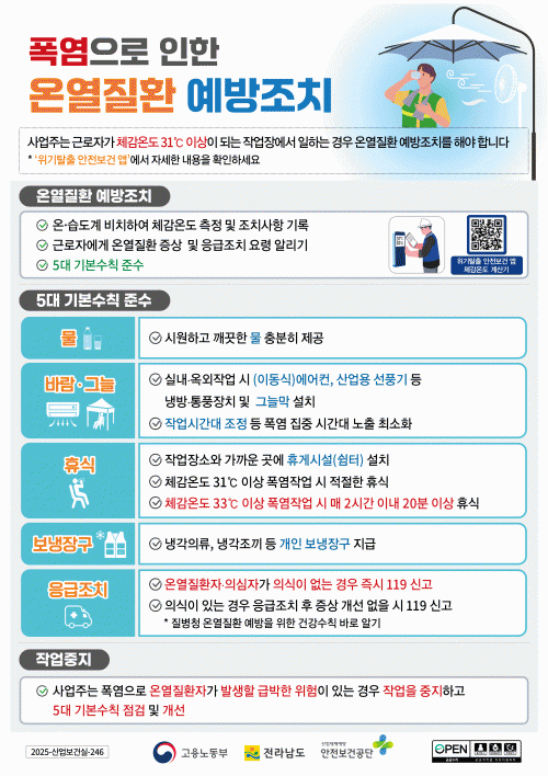 Àü³²µµ´Â Æø¿° ¼Ó ¿Â¿­ÁúȯÀ» ¿¹¹æÇϱâ À§ÇØ ¡ã¹° ÀÚÁÖ ¸¶½Ã±â(°¥Áõ ´À³¢Áö ¾Êµµ·Ï Á¤±âÀû ¼·Ãë) ¡ãÇѳ· ¾ß¿Ü Ȱµ¿ ÀÚÁ¦(¿ÀÈÄ 2½Ã~5½Ã ÇÇÇϱâ) ¡ã½Ã¿øÇÑ ¿ÊÂ÷¸²°ú ÈÞ½Ä(¸Å 2½Ã°£ ÀÛ¾÷ ÈÄ 20ºÐ ÀÌ»ó ÈÞ½Ä) ¡ã¾îÁö·¯¿ò, ±ÙÀ°°æ·Ã ½Ã Áï½Ã Áß´ÜÇϰí 119 ½Å°í µî µµ¹Î°ú ÀÛ¾÷ÀÚ¿¡°Ô ¿¹¹æ ¼öÄ¢ Áؼö¸¦ ´çºÎÇß´Ù.