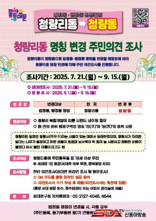 [½Åµ¿¾Æ¹æ¼Û µ¿´ë¹®±¸=À̽ŵ¿±âÀÚ] ¼­¿ï µ¿´ë¹®±¸´Â û·®¸®µ¿(¹ýÁ¤µ¿ ¹× ÇàÁ¤µ¿)ÀÇ ¸íĪÀ» ¡®Ã»·®µ¿¡¯À¸·Î º¯°æÇÏ´Â ¹æ¾È¿¡ ´ëÇØ Áö¿ª ÁÖ¹ÎÀÇ ÀǰßÀ» ¼ö·ÅÇϰíÀÚ 7¿ù 21ÀÏ(¿ù)ºÎÅÍ 9¿ù 15ÀÏ(¿ù)±îÁö û·®¸®µ¿ Àü ¼¼´ë¸¦ ´ë»óÀ¸·Î ÁÖ¹ÎÀǰßÁ¶»ç¸¦ ½Ç½ÃÇÑ´Ù°í ¹àÇû´Ù.