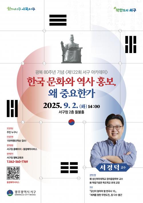 [½Åµ¿¾Æ¹æ¼Û=ÀÌÁöÇö±âÀÚ] ±¤ÁÖ±¤¿ª½Ã ¼­±¸(±¸Ã»Àå ±èÀ̰­)´Â ±¤º¹ 80ÁÖ³âÀ» ±â³äÇØ ¼­°æ´ö ¼º½Å¿©ÀÚ´ëÇб³ ±³¼ö ÃÊû Á¦122ȸ ¼­±¸ ¾ÆÄ«µ¥¹Ì¸¦ °³ÃÖÇÑ´Ù. ¼­±¸´Â ¿À´Â 9¿ù 2ÀÏ ¿ÀÈÄ 2½Ã ¼­±¸Ã» µéºÒȦ¿¡¼­ ¡®Çѱ¹ ¹®È­¿Í ¿ª»ç È«º¸, ¿Ö Áß¿äÇѰ¡¡¯¸¦ ÁÖÁ¦·Î ¼­ ±³¼ö °­¿¬À» °³ÃÖÇÑ´Ù°í ¹àÇû´Ù.