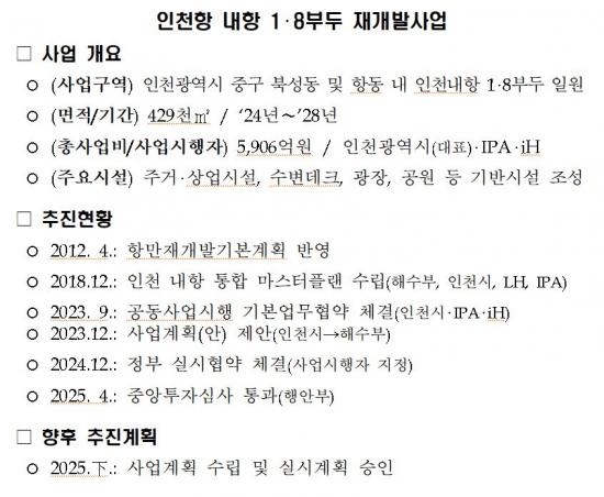 ÀÎõÇ× ³»Ç× Àç°³¹ßÀº ÃÑ 3´Ü°è·Î ÃßÁøµÈ´Ù. 1´Ü°èÀÎ 1‧8ºÎµÎ Àç°³¹ß »ç¾÷Àº Áö³ 4¿ù Áß¾ÓÅõÀڽɻ縦 Åë°úÇßÀ¸¸ç, ¿ÃÇØ ¾ÈÀ¸·Î ½Ç½Ã°èȹ ½ÂÀÎÀ» ¸ñÇ¥·Î ½Å¼ÓÈ÷ ÁøÇà ÁßÀÌ´Ù. 2´Ü°è »ç¾÷Àº ±¹°¡°èȹ ¹Ý¿µÀ» À§ÇÑ ÇùÀǰ¡ À̾îÁö°í ÀÖ¾î, 2007³â ½Ã¹Îû¿øÀ¸·Î ½ÃÀÛµÈ ³»Ç× Àç°³¹ßÀÌ ¾à 18³â ¸¸¿¡ ÀÎõ½Ã ÁÖµµ·Î º»°Ýȵǰí ÀÖ´Ù.