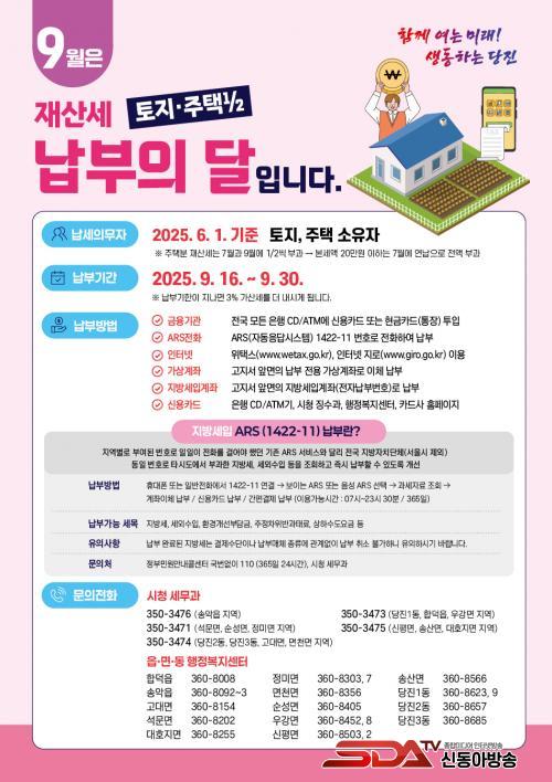 9¿ù Á¤±âºÐ Àç»ê¼¼´Â °ú¼¼±âÁØÀÏ(6¿ù 1ÀÏ) ÇöÀç ÁÖÅà ¹× ÅäÁö ¼ÒÀ¯ÀÚ¿¡°Ô ºÎ°úµÇ´Â ¼¼±ÝÀ¸·Î ÁÖÅúРÀç»ê¼¼´Â ³³¼¼ÀÚÀÇ ¼¼ ºÎ´ã ¿Ïȸ¦ À§ÇØ Àç»ê¼¼¾×ÀÌ 20¸¸ ¿øÀ» ÃʰúÇÒ °æ¿ì 7¿ù°ú 9¿ù °¢°¢ 2ºÐÀÇ 1¾¿ ºÎ°úµÇ°í, ÅäÁöºÐ Àç»ê¼¼´Â 9¿ù¿¡ Àü¾× ºÎ°úµÈ´Ù.