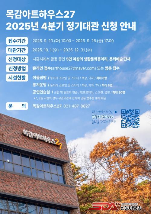 ½Åû ´ë»óÀº ¸ñ°¨¾ÆÆ®ÇϿ콺27¿¡¼­ ½ÃÈï½Ã¿¡¼­ Ȱµ¿ ÁßÀÎ »ýȰ¹®È­µ¿¾Æ¸®¿Í ¹®È­¿¹¼ú ´Üü´Ù. ´ë°ü °¡´É °ø°£Àº µ¿¾Æ¸® ¼Ò¸ðÀÓ ¹× ½ºÅ͵ð·Î »ç¿ë °¡´ÉÇÑ 3Ãþ ¾î¿ï¸²¹æ°ú Èï°Ü¿î¹æ, °ø¿¬ ¹× ¹ßǥȸ ¿¬½ÀÀÌ °¡´ÉÇÑ 3Ãþ °ø¿¬¿¬½À½ÇÀ̸ç 1, 2ÃþÀÇ °æ¿ì À¯°ü±â°ü ¹× ´Üü °ø¹® ÇùÁ¶¿¡ ÀÇÇØ ´ë°üÀÌ °¡´ÉÇÏ´Ù. ½ÉÀǸ¦ °ÅÃÄ ¼±Á¤µÉ °æ¿ì 10¿ùºÎÅÍ 12¿ù±îÁö ÃÑ 3°³¿ù°£ ¸ñ°¨¾ÆÆ®ÇϿ콺27 °ø°£À» ÀÌ¿ëÇÒ ¼ö ÀÖ´Ù.