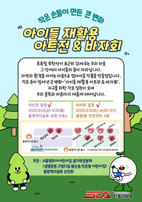 ÀçȰ¿ë ¾ÆÆ®ÀüÀº ÀÚ¿¬°ú ȯ°æÀ» ¾Æ³¢´Â ¾ÆÀ̵éÀÇ ²ÞÀ» ÀÀ¿øÇϰí ħüµÈ Áö¿ª »ó±Ç¿¡ Ȱ·ÂÀ» ºÒ¾î³Ö±â À§ÇØ ¸¶·ÃµÆ´Ù. ºÒ±¤¸ÔÀÚ°ñ¸ñ »óÀÎȸ´Â »óÁ¡°¡ ³» Àü½Ã °ø°£À» Á¦°øÇÏ°í ²ÄÁö¶ô°øµ¿Ã¼¿Í Çù·ÂÇØ Áö¿ª°ú ¾î¸°À̰¡ ¾î¿ì·¯Áö´Â ÀåÀ» ¸¸µå´Â µ¥ ÈûÀ» º¸ÅÉ´Ù.