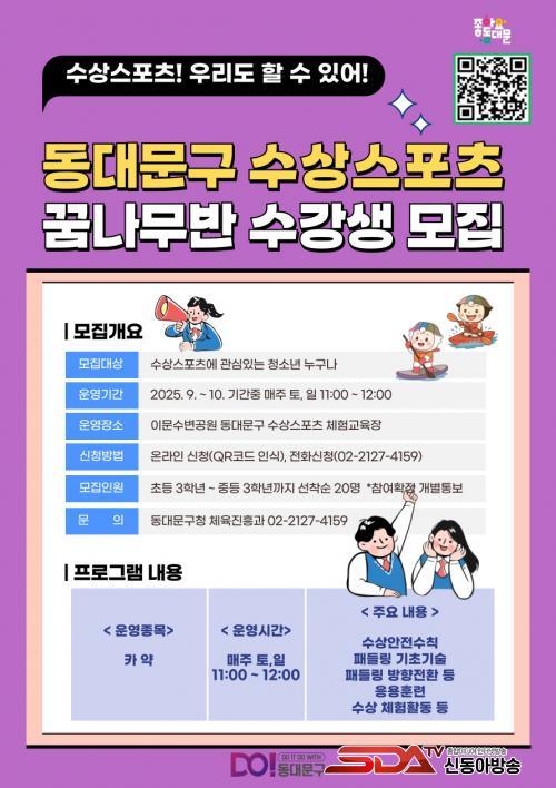 ¡¸¼ö»ó½ºÆ÷Ã÷ ²Þ³ª¹«¹Ý¡¹Àº Ä«¾à°ú SUP(Stand Up Paddleboard) µî ¼ö»ó½ºÆ÷Ã÷¸¦ Á÷Á¢ ¹è¿ì°í Áñ±æ ¼ö Àִ üÇèÇü ½ºÆ÷Ã÷ ÇÁ·Î±×·¥ÀÌ´Ù. Áö³ 6¿ù 1ÀϺÎÅÍ ¿î¿µ ÁßÀÎ µ¿´ë¹®±¸ ¼ö»ó½ºÆ÷Ã÷üÇè±³À°Àå¿¡¼ ÁøÇàµÇ¸ç ¼ö»ó ¾ÈÀü±³À°, Àü¹® °»çÀÇ ´Ü°èº° Áöµµ¸¦ ÅëÇØ Âü°¡ÀÚµéÀÌ ¾ÈÀüÇÏ°Ô ½ºÆ÷Ã÷¸¦ Áñ±â¸é¼ ½Ç·ÂÀ» ½×À» ¼ö ÀÖµµ·Ï ±¸¼ºµÆ´Ù.