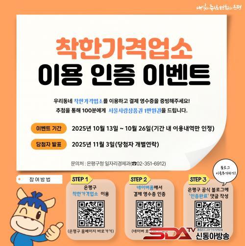 [½Åµ¿¾Æ¹æ¼Û ÀºÆò±¸=À̽ŵ¿±âÀÚ] ¼­¿ï ÀºÆò±¸´Â Áö¿ª °æÁ¦ Ȱ¼ºÈ­¿Í ¹°°¡ ¾ÈÁ¤ ºÐÀ§±â Á¶¼ºÀ» À§ÇØ 13ÀϺÎÅÍ ¿À´Â 26ÀϱîÁö 2ÁÖ°£ ¡®ÂøÇѰ¡°Ý¾÷¼Ò ÀÌ¿ë ÀÎÁõ À̺¥Æ®¡¯¸¦ ÁøÇàÇÑ´Ù°í ¹àÇû´Ù.