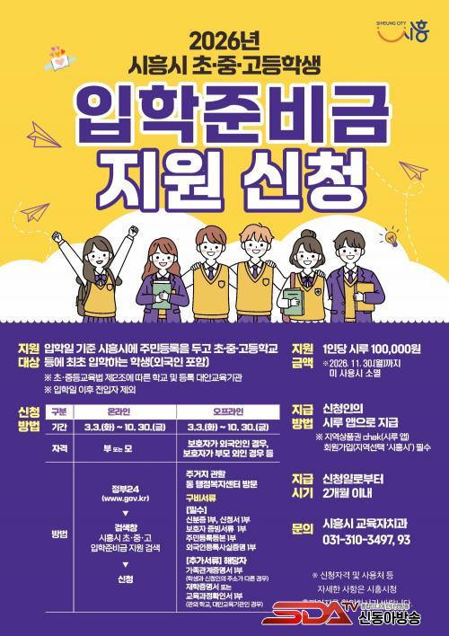 Áö¿ø ´ë»óÀº ÀÔÇÐÀÏ(3¿ù 3ÀÏ) ±âÁØ, ½ÃÈï½Ã¿¡ ÁÖ¼Ò¸¦ µÐ ÃÊÁß°í ½ÅÀÔ»ý 1¸¸ 6õ¿© ¸í(¿Ü±¹ÀÎ Æ÷ÇÔ)ÀÌ´Ù. ½Ã´Â À̵鿡°Ô 1Àδç 10¸¸ ¿ø¾¿ ½ÃÈï Áö¿ªÈÆó ¸ð¹ÙÀÏ ¡®½Ã·ç¡¯·Î Áö±ÞÇÑ´Ù.