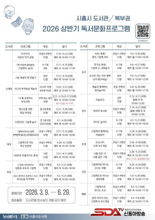 [½Åµ¿¾Æ¹æ¼Û ½ÃÈï½Ã=À̽ŵ¿±âÀÚ] ½ÃÈï½Ã ºÏºÎ±Ç 8°³ °ø°øµµ¼­°ü(¼Ò·¡ºû¤ý´ë¾ß¤ý¸ñ°¨¤ý´É°î¤ýÀå°î¤ýÀº°è¤ý½Åõ¤ý¸ÅÈ­)Àº ¿À´Â 3¿ùºÎÅÍ 6¿ù±îÁö »ó¹Ý±â µ¶¼­¹®È­ ÇÁ·Î±×·¥ 26°³¸¦ ¿î¿µÇϰí, ½Ã¹Î 292¸íÀ» ´ë»óÀ¸·Î ´Ù¾çÇÑ µ¶¼­¡¤¹®È­ üÇè ±âȸ¸¦ Á¦°øÇÑ´Ù.