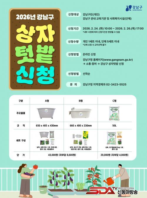 ºÐ¾çÀ» ¿øÇÏ´Â ±¸¹Î ¶Ç´Â ´Üü´Â 24ÀÏ ¿ÀÀü 10½ÃºÎÅÍ 26ÀÏ ¿ÀÈÄ 5½Ã »çÀÌ¿¡ °­³²±¸Ã» ȨÆäÀÌÁö(¼ÒÅ롤Âü¿©¡æ½Åû¡æ°­³²±¸ »óÀÚÅÔ¹ç ½Åû)¿¡¼­ ½ÅûÇÏ¸é µÈ´Ù. °³ÀÎÀº 1¼¼´ë´ç 1¼¼Æ®, ±³À°±â°ü¡¤»çȸº¹Áö½Ã¼³Àº ÃÖ´ë 5¼¼Æ®±îÁö ½ÅûÇÒ ¼ö ÀÖÀ¸¸ç, A¡¤B¡¤C À¯Çü Áß ¿øÇÏ´Â ¼¼Æ®¸¦ ¼±ÅÃÇØ ½ÅûÇÏ¸é µÈ´Ù. ½Åû ÈÄ ¾È³» °èÁ·ΠÀںδã±Ý(¼¼Æ®´ç A¡¤BÇü 8,600¿ø, CÇü 4,000¿ø)À» ÀÔ±ÝÇϸé 3¿ù 16ÀÏ ÀÌÈÄ ½Åû Àå¼Ò·Î ¹«·á ¹è¼ÛÇÑ´Ù.