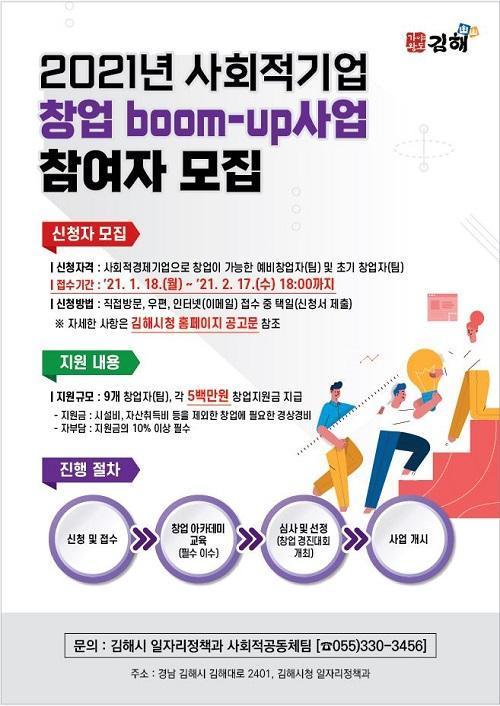 [½Åµ¿¾Æ¹æ¼Û´º½º=ÀÌÇýºó ±âÀÚ] ±èÇØ½Ã´Â ¾îÁ¦ÀÎ 18ÀϺÎÅÍ 2¿ù 17ÀϱîÁö ¡°2021³â »çȸÀû±â¾÷ â¾÷ ºÕ¾÷ »ç¾÷¡± Âü¿©ÀÚ¸¦ ¸ðÁýÇÕ´Ï´Ù. »çȸÀû±â¾÷ ÁøÀÔÀ» Èñ¸ÁÇÏ´Â ¿¹ºñâ¾÷ÀÚ ¹× Ãʱââ¾÷ÀÚ´Â ´©±¸³ª ½ÅûÀÌ °¡´ÉÇÕ´Ï´Ù. ½ÅûÀÚ´Â »çȸÀû±â¾÷ÀÇ ÀÌÇØ, »ç¾÷¿¹»ê ¼ö¡¦