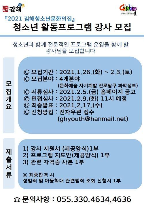 [½Åµ¿¾Æ¹æ¼Û´º½º=ÀÌÇýºó ±âÀÚ] ±èÇØÃ»¼Ò³â¹®È­ÀÇÁýÀº ¿À´Â 26ÀϺÎÅÍ ¿Â¶óÀÎ ºñ´ë¸é ÇÁ·Î±×·¥ ÁøÇàÀ» À§ÇÑ °¢ ºÐ¾ßº° Àü¹®°­»ç¸¦ ¸ðÁýÇÑ´Ù°í ¹àÇû½À´Ï´Ù. ¸ðÁýºÐ¾ß´Â ¹®È­¿¹¼ú, ÀÚ±â°è¹ß, Áø·Îޱ¸, °úÇÐÁ¤º¸ µî 4°³·Î ³ª´©¾î¼­ ¼±¹ßÇÕ´Ï´Ù. »çȸÀû °Å¸®µÎ±â Áöħ¿¡¡¦