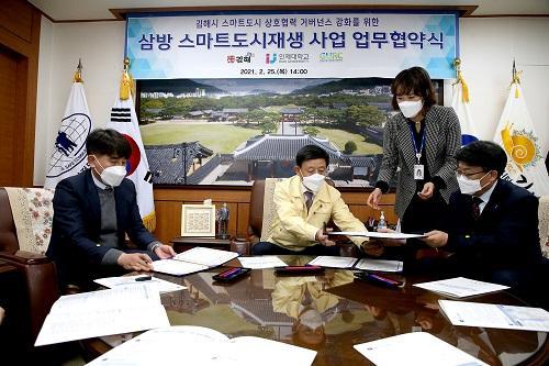 [½Åµ¿¾Æ¹æ¼Û´º½º=ÀÌÇýºó ±âÀÚ] ±èÇØ½Ã´Â Áö³­ 25ÀÏ ½ÃÀå½Ç¿¡¼­ Ç㼺°ï ½ÃÀå, Àü¹ÎÇö ÀÎÁ¦´ëÇб³ ÃÑÀå, ³²ÅÃÁÖ ±èÇØ½Ãµµ½ÃÀç»ýÁö¿ø¼¾ÅÍÀåÀÌ Âü¼®ÇÑ °¡¿îµ¥ »ï¹æ ½º¸¶Æ®µµ½ÃÀç»ý »ç¾÷ÀÇ ¼º°øÀû ÃßÁøÀ» À§ÇÑ ¾÷¹«Çù¾àÀ» ü°áÇß½À´Ï´Ù. 3-¹æ(ÁÖ¹Î, û³â, ´ëÇÐ)ÀÌ ¼ÒÅëÇÏ°í¡¦