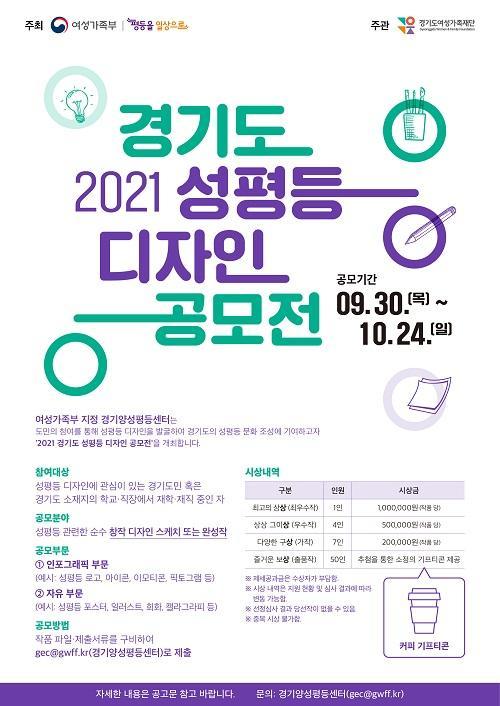 [½Åµ¿¾Æ¹æ¼Û´º½º=¹èÁöÀ± ±âÀÚ] °æ±âµµ¿©¼º°¡Á·Àç´Ü °æ±âµµ¾ç¼ºÆòµî¼¾ÅͰ¡ ¡®2021 °æ±âµµ ¼ºÆòµî µðÀÚÀÎ °ø¸ðÀü¡¯À» ¿À´Â 24ÀϱîÁö °³ÃÖÇÕ´Ï´Ù. °æ±âµµ¹Î°ú °æ±âµµ ¼ÒÀç Çб³, Á÷Àå¿¡ ÀçÇÐ, ÀçÁ÷Çϰí ÀÖ´Â »ç¶÷ÀÌ¸é ´©±¸³ª ÀÀ¸ð °¡´ÉÇÕ´Ï´Ù. °ø¸ð ºÎ¹®Àº ¼ºÆòµî ¡¦