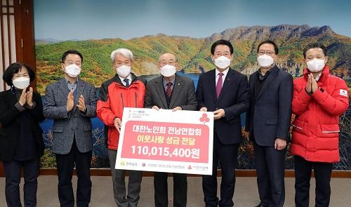 [½Åµ¿¾Æ¹æ¼Û´º½º=Á¤ÁöÀ± ±âÀÚ] Àü¶ó³²µµ´Â 17ÀÏ ¿ÀÀü µµÃ»¿¡¼­ »ç´Ü¹ýÀÎ ´ëÇѳëÀÎȸ Àü³²¿¬ÇÕȸ ȸ¿ø µîÀÌ ¸ð±ÝÇÑ 1¾ï 1õ¸¸ ¿øÀ» Äڷγª19 ±Øº¹ ¼º±ÝÀ¸·Î ±âŹ¹Þ¾Ò½À´Ï´Ù. À̹ø ¼º±ÝÀº Àü³²³ëÀÎȸ¿¡¼­ ½Ã±º Áöȸ¿Í ÁÖ¿ä °æ·Î´ç µî 1õ600°³¼Ò¿¡ ¸ð±ÝÇÔÀ» ¼³Ä¡ÇØ Áö¡¦