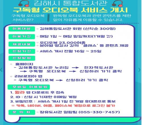 [½Åµ¿¾Æ¹æ¼Û´º½º=¾çÇýÁö±âÀڣݱèÇØ½Ã ÀåÀ¯µµ¼­°üÀÌ 7¿ù 1ÀϺÎÅÍ ±¸µ¶Çü ¿Àµð¿ÀºÏ ¼­ºñ½º¸¦ »õ·Ó°Ô ½ÃÀÛÇÑ´Ù°í ¹àÇû½À´Ï´Ù. µ¶¼­ ÄÜÅÙÃ÷ ´Ù¾çÈ­¿¡ ¹ß¸ÂÃç ½Ã¡¤°ø°£ Á¦¾à ¾ø´Â ÀÌ¿ëÀÚ Áß½ÉÀÇ Ã¥¹®È­¼­ºñ½º¸¦ Á¦°øÇϱâ À§ÇØ ¸¶·ÃµÈ À̹ø ¼­ºñ½º´Â. ±èÇØÅëÇÕµµ¼­¡¦